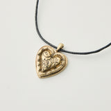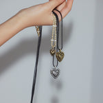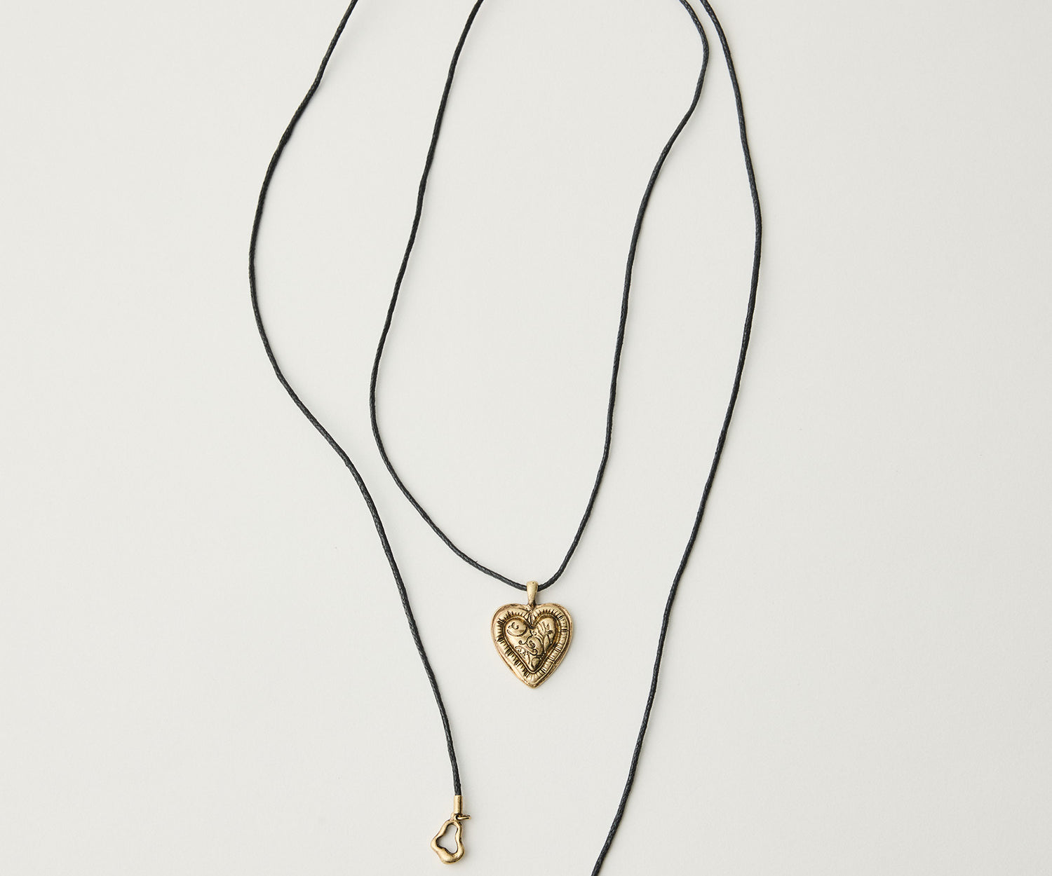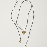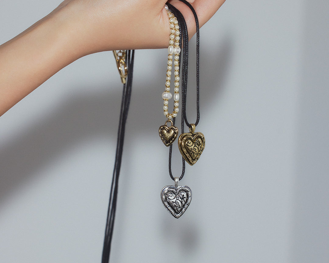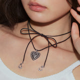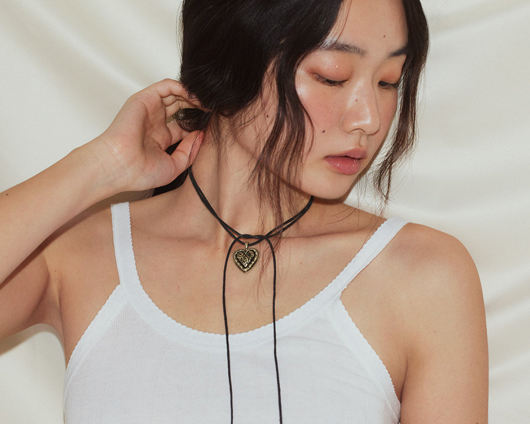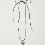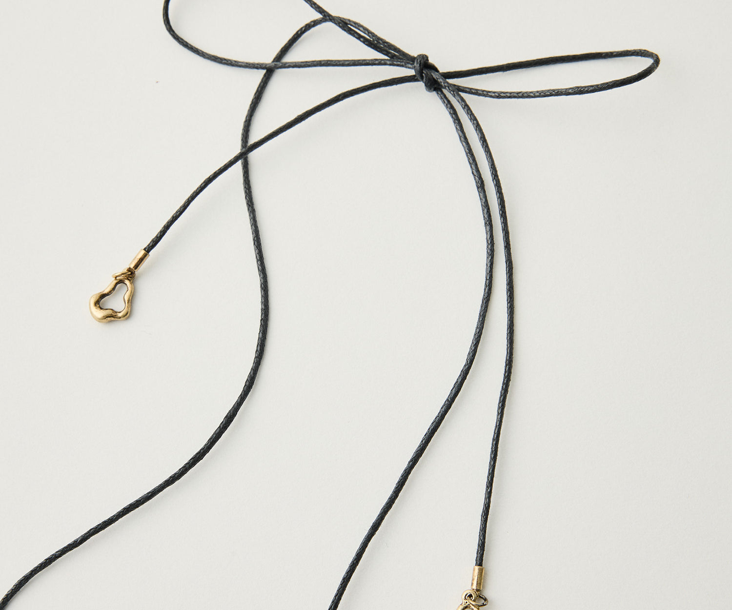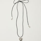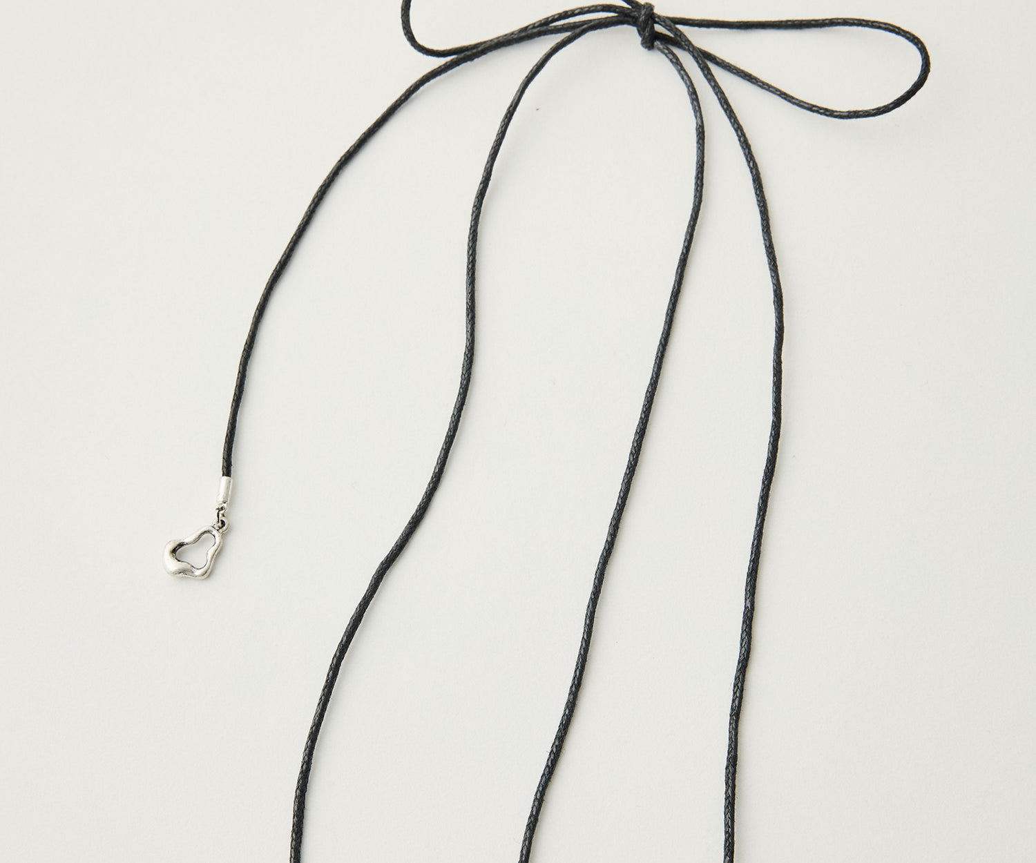 トップに大きめのハートが付いた紐仕様のチョーカー。 自分の好きな長さでリボン結びをしたり、1周だけ首に巻いてコードを垂らしたり、色々な巻き方でお使いいただけます。チョーカーネックレスのように短めにしたりヘアアレンジに使うのもおすすめです。 大きなハートチャームがデコルテ部分を華やかに見せてくれます。